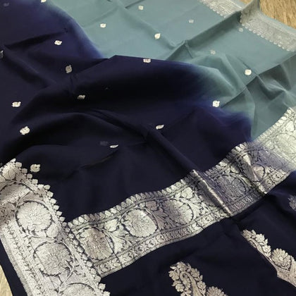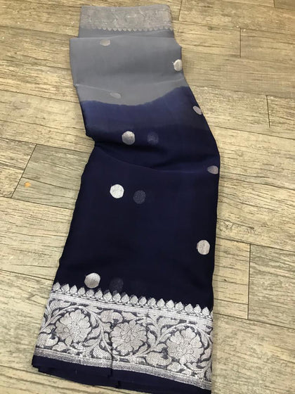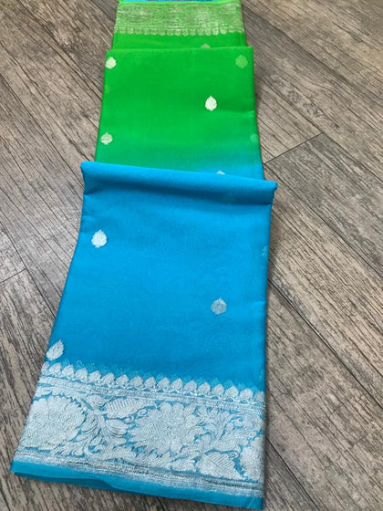 Iconic and lovely handcrafted, vividly colored shaded Pure Khaddi Georgette or Banarasi Saree. It's a mix of Banaras and Gujarati karigari. Such sarees have zari work done in Banaras, while the Bandhej saree and bandhani lehenga are made from a tye and coloring process in Gujarat. As a result, a typical saree takes roughly two months to complete. As a result, a single saree requires a great deal of effort. Banarasi khaddi georgette, pure chiffon sarees or light chiffon sarees in various shades are a need in any woman's wardrobe.