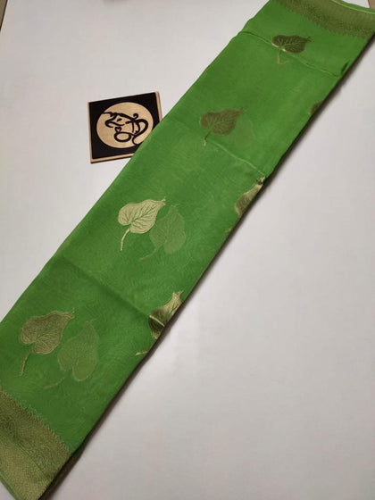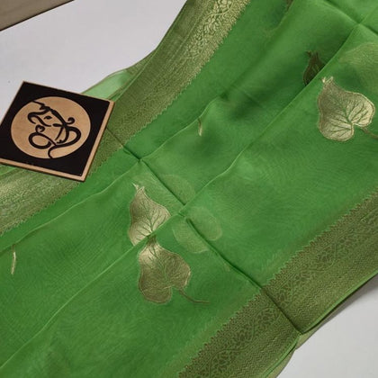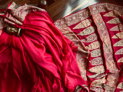 Moreover, you may notice a string of upright leaves known as 'Jhallar.' These Banarasi silk sarees are known for their heavy gold work, intricate figures, metallic effects, and tight weaving.