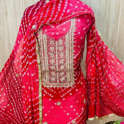You can get a broad collection of Bandhani Suits among gota patti suits, banarasi suits and kota doria suits at Jhakhas.com to add elegance to your appearance. Bandhej Suits online can meet all of your requirements for a classy appearance at different events. Choosing the perfect designs to complement your attractiveness in a Bandhani suit and bandhej saree need both effort and patience. Jhakhas.com is the ideal way to add a touch of Indian charm to any look.