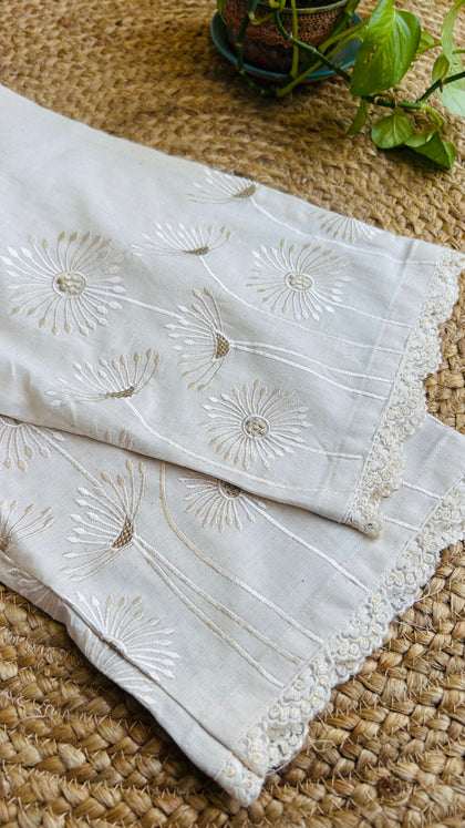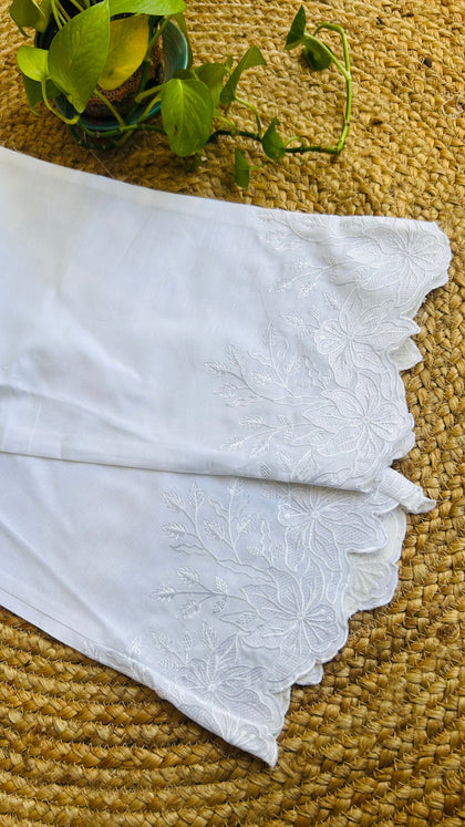 The trend of wearing white trousers or pants—which many may have gotten tired of—should be revived right now with white cotton palazzo pants embroidered with chikankari. It's a well-known wardrobe essential for ladies who want to dress comfortably and consistently follow cultural trends. Floral border designs will be in style for many months or even years to come. In order to appear stylish, women try to keep up with the latest trends in fashion throughout the year. Let's return to the days of our white palazzo trousers (or regular trouser pants, for that matter).