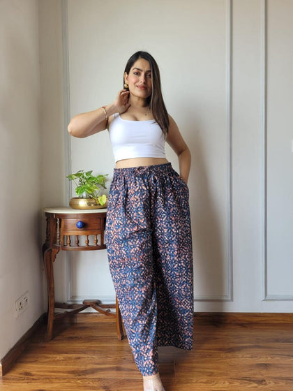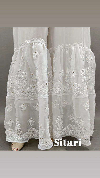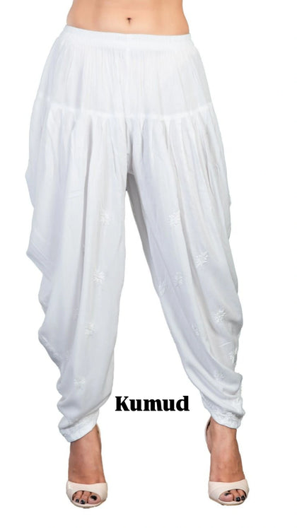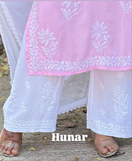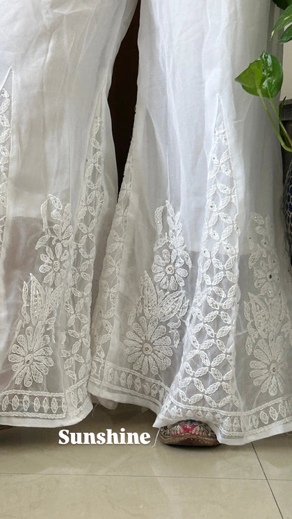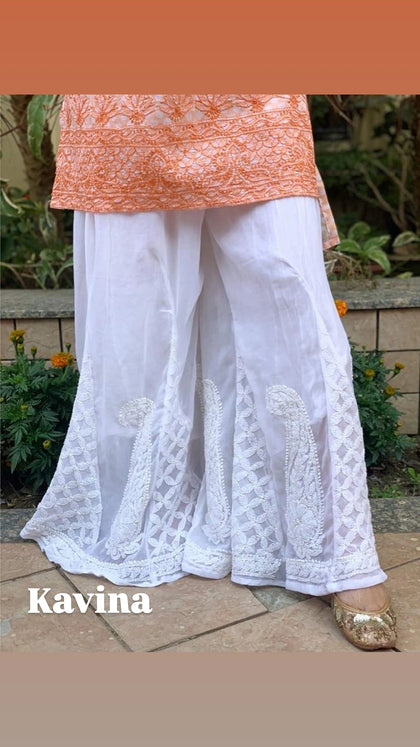 The trend of wearing white trousers or pants—which many may have gotten tired of—should be revived right now with white cotton palazzo pants embroidered with chikankari. It's a well-known wardrobe essential for ladies who want to dress comfortably and consistently follow cultural trends. Floral border designs will be in style for many months or even years to come. In order to appear stylish, women try to keep up with the latest trends in fashion throughout the year. Let's return to the days of our white palazzo trousers (or regular trouser pants, for that matter).