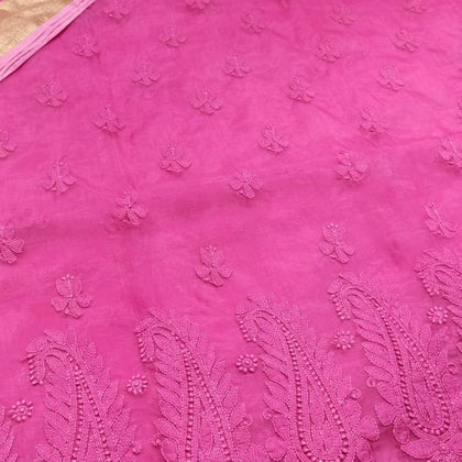 Organza, a lightweight sheer fabric with a luxurious texture, is typically made from pure silk yarn. It serves as a beautiful canvas for some of the most exquisite garments, especially those featuring Chikankari embroidery.Chikankari sarees and chikankari suits are created through a meticulous craft process, involving hand-carved wooden blocks for printing various design patterns, natural dyes for printing, and skilled artisans using a 10-needlecraft embroidery technique to achieve flawless stitching.