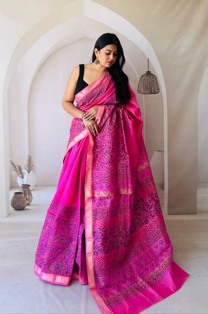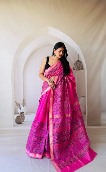 Rani Pink Maheshwari Silk Bagru Hand Block Print Saree