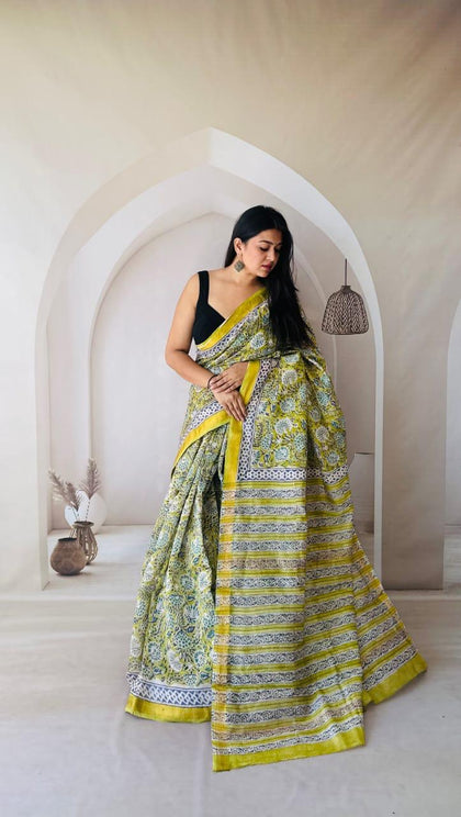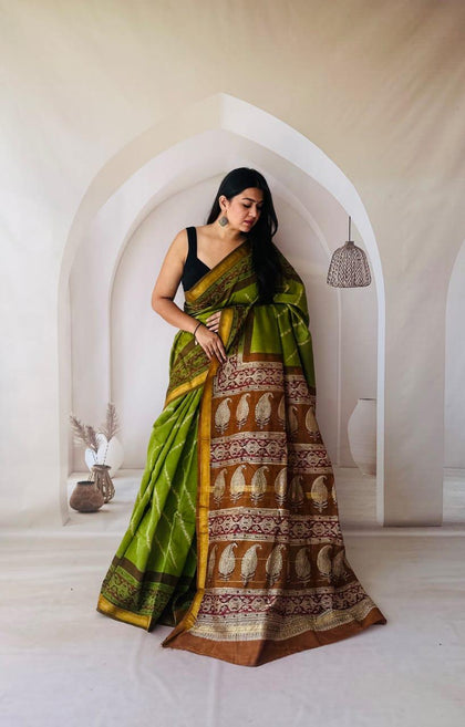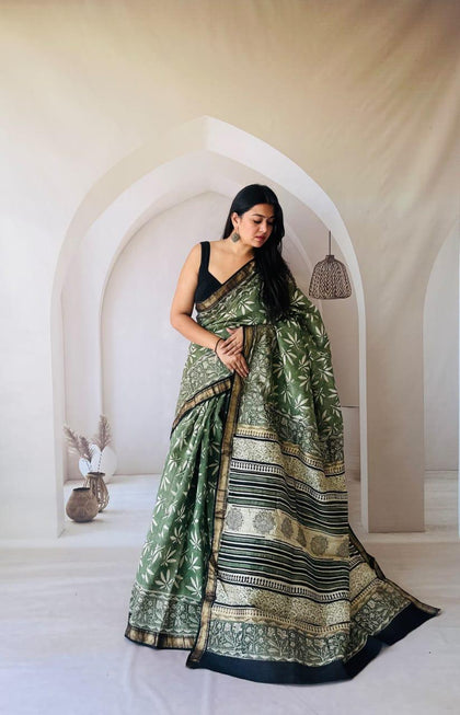 Olive Green Maheshwari Silk Bagru Hand Block Print Saree