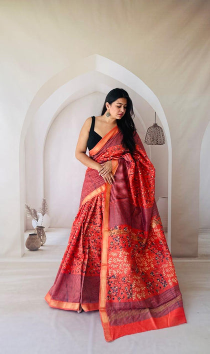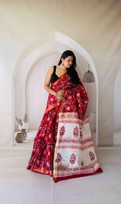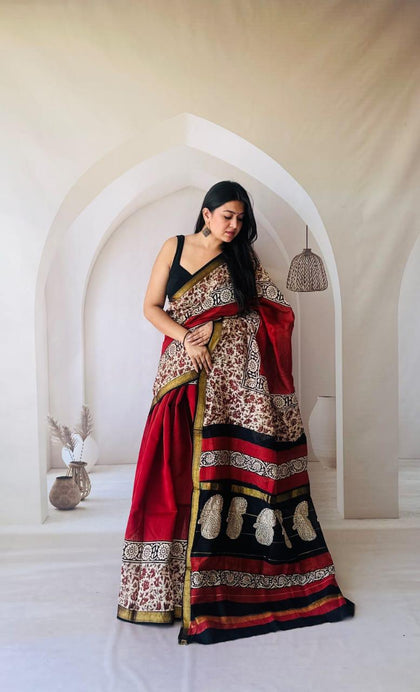 Red Maheshwari Silk Bagru Hand Block Print Saree