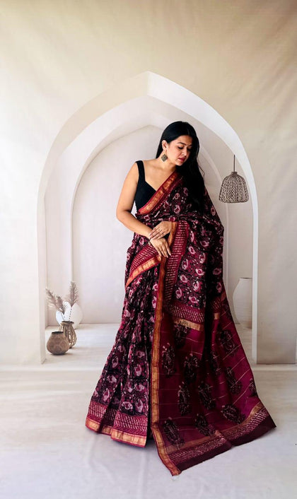 Maroon Maheshwari Silk Bagru Hand Block Print Saree