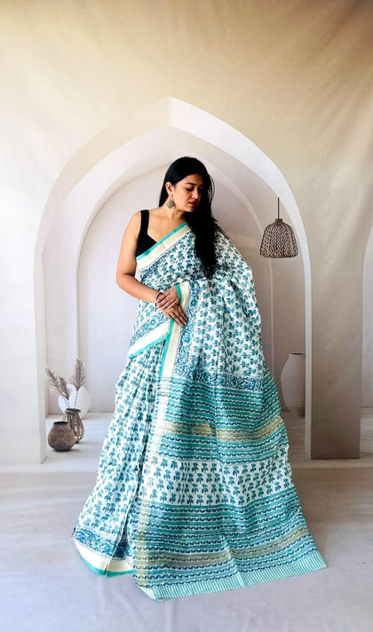 Green Maheshwari Silk Bagru Hand Block Print Saree