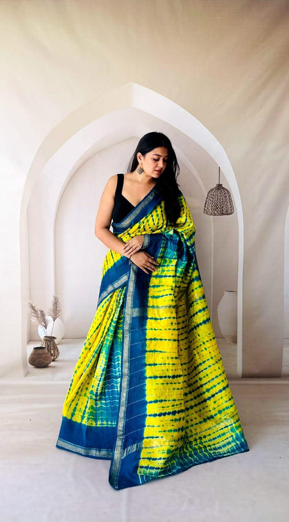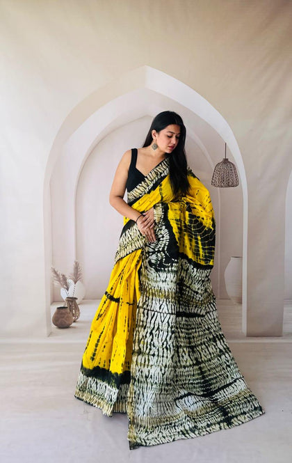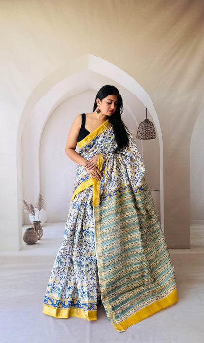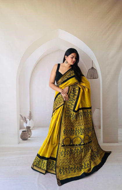 Yellow Maheshwari Silk Bagru Hand Block Print Saree