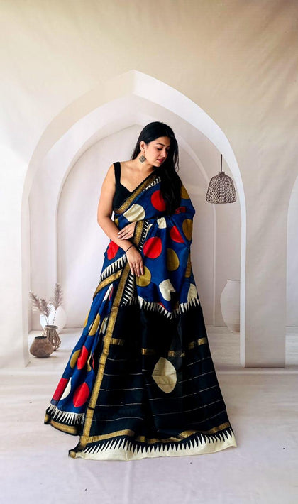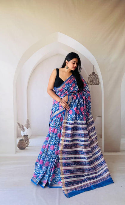 Blue Maheshwari Silk Bagru Hand Block Print Saree