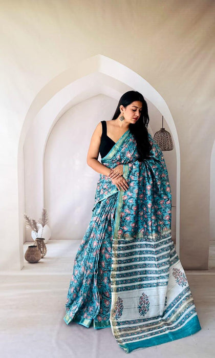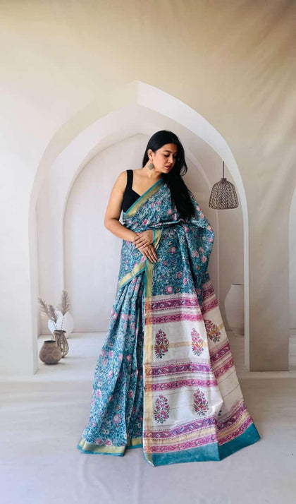 Sea Blue Maheshwari Silk Bagru Hand Block Print Saree