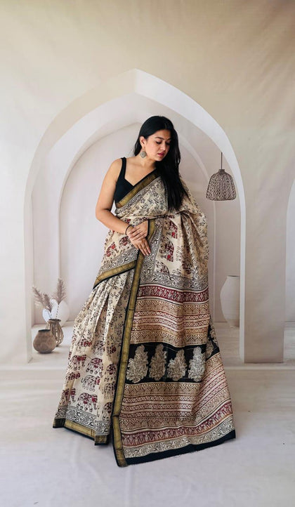 Off white Maheshwari Silk Bagru Hand Block Print Saree