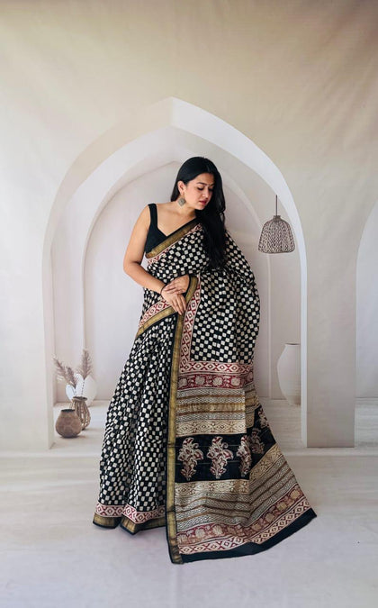 Black Maheshwari Silk Bagru Hand Block Print Saree