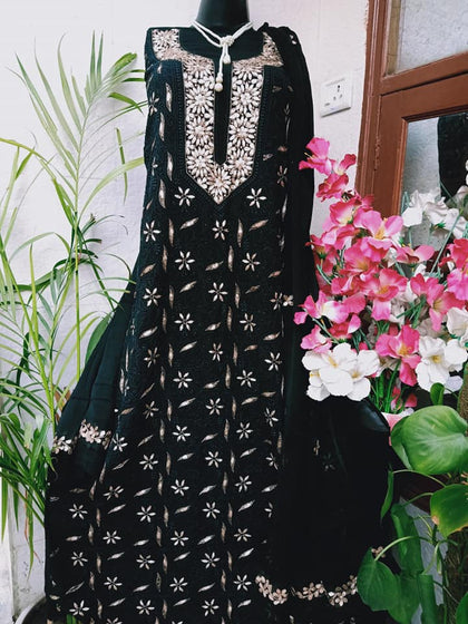 Trending Black Georgette Lucknowi Chikankari Kurti Set Unstitched