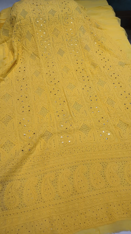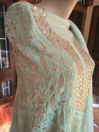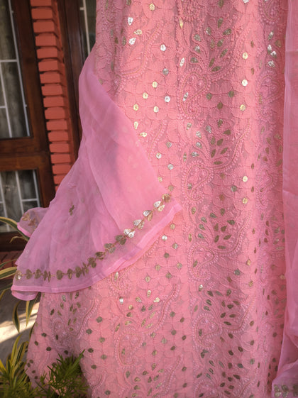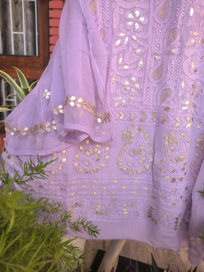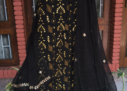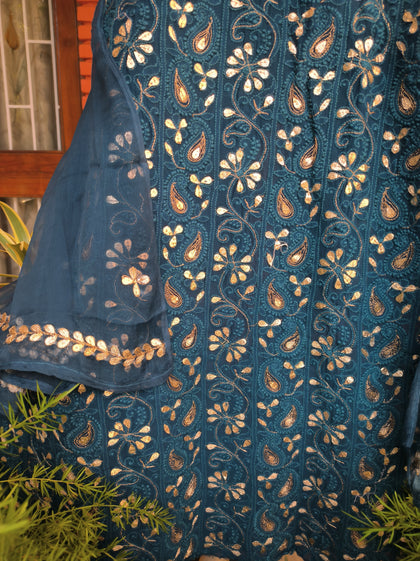 Chikankari and floral motifs are inextricably linked because of the major persian influence, flowers have long been a staple, with stems, buti, and leaves added to complete the pattern. Mukaish, Kamdani, gota patti work and Badla motifs, as well as sequin, bead, and mirror work, provide depth to the otherwise basic work.