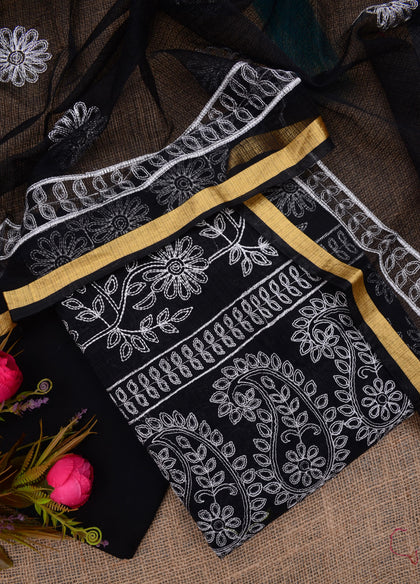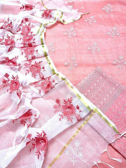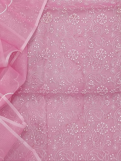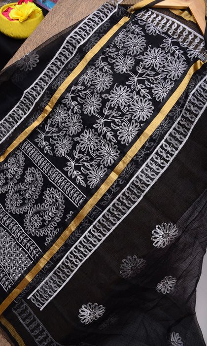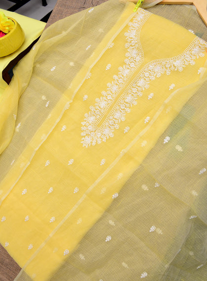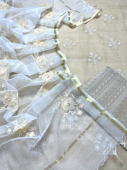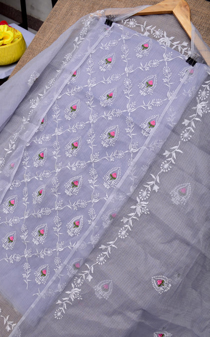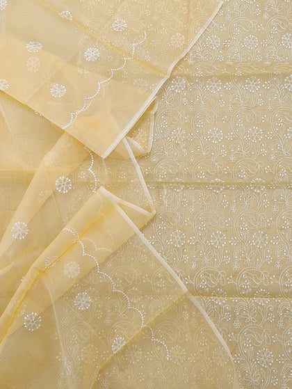 The first use of chikankari dates back to the Mughal Empire. Our chikankari-inspired ensembles include handcrafted intricate thread embroidery on timeless materials. Conversely, Kota suits, also known as Kota doria sarees, are a distinctive type of handwoven clothing with a square-checkered pattern. This fabric's unique qualities include its softness, agility, and fine yarn, which are attained by polishing the warp yarn using a particular starch or kanji. Some incredibly intricate and exquisite salwar garments are produced when these two antiquated methods are blended together.