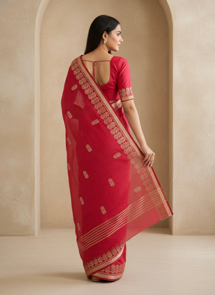 Kota Doria, which means "thread", is one of the various varieties of saris created in Kota, Rajasthan. The intricate weaving of Kota Doria saree is made of fine threads, making them lightweight and easy to drape. Crafted from pure cotton, silk, and transparent muslin fabric, these sarees possess a sheer appearance owing to the distinctive khats of Kota, woven on traditional pit looms. Available in an array of soft pastel hues and adorned with patterns ranging from floral motifs to geometric designs, Kota suits and sarees are perfect for both casual wear and gifting purposes.