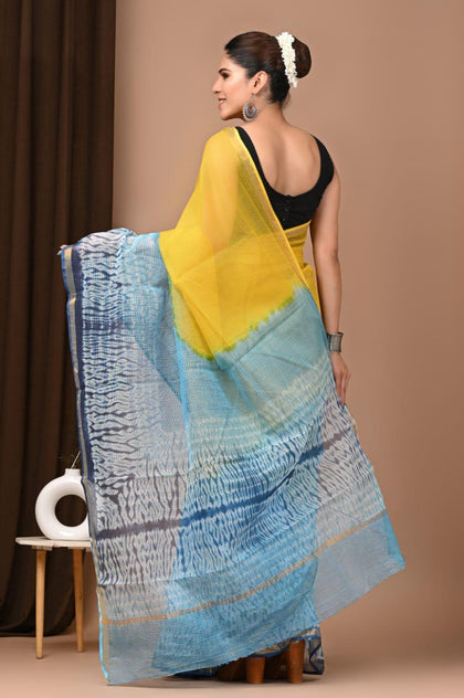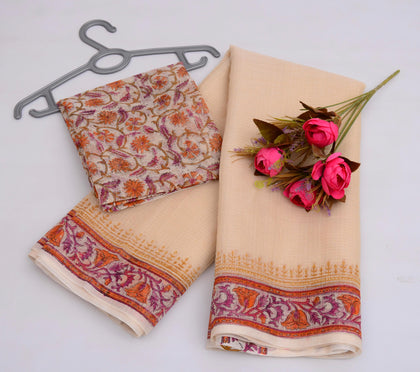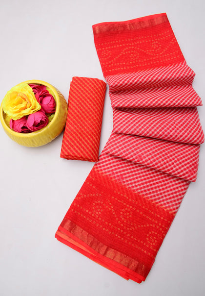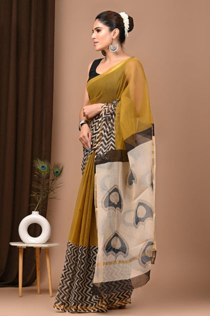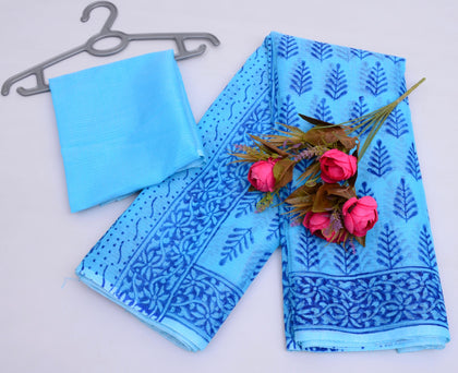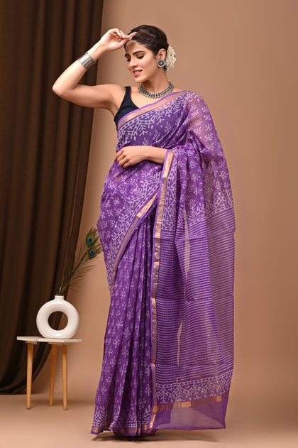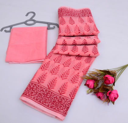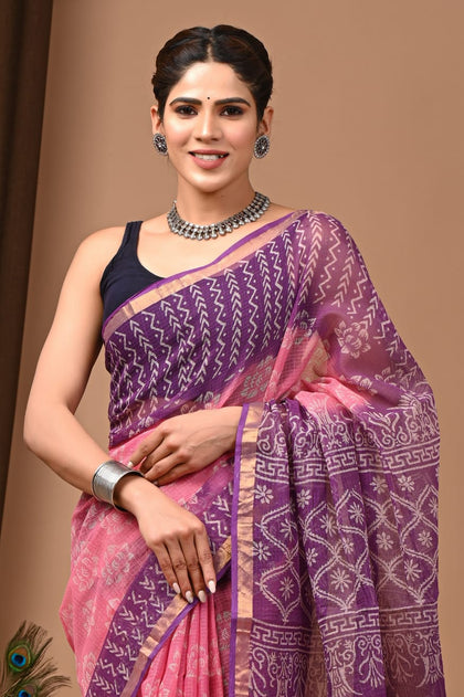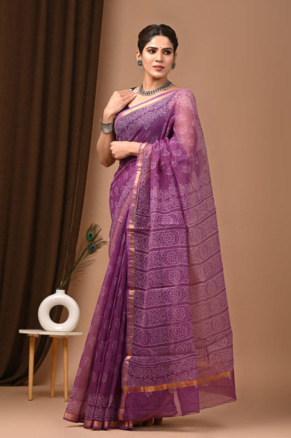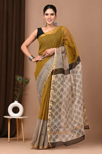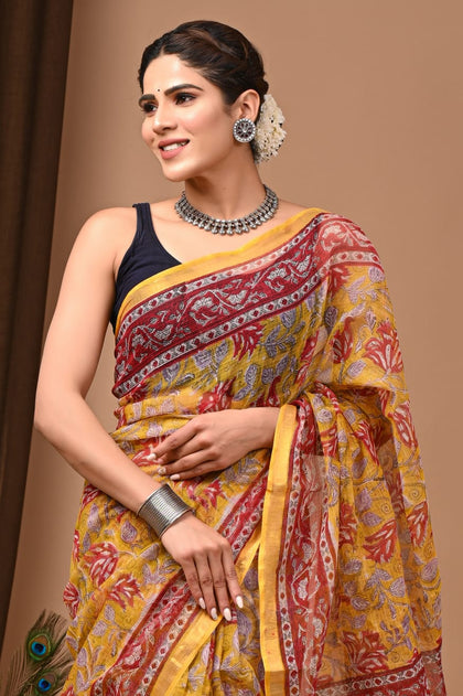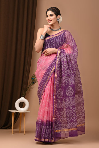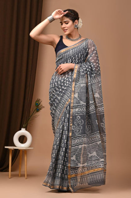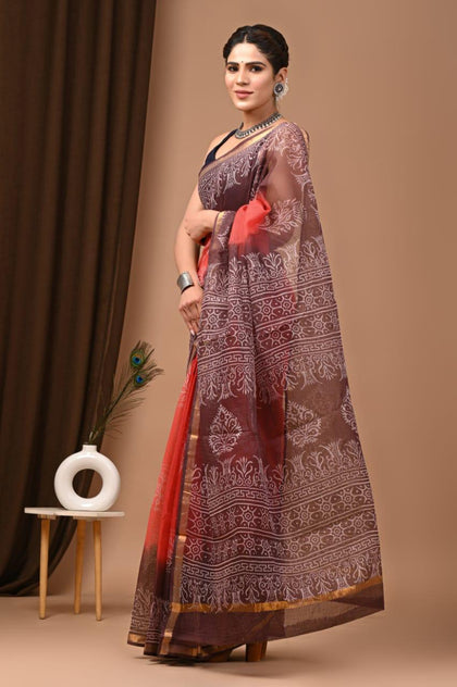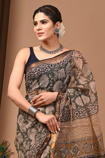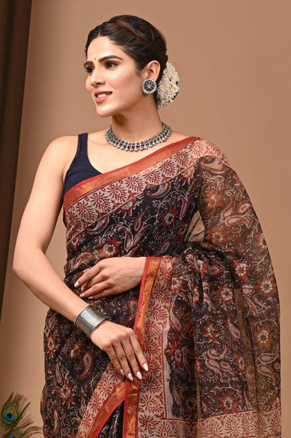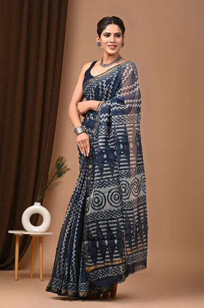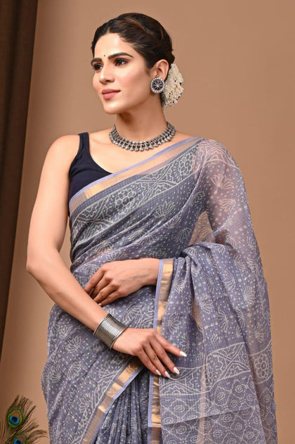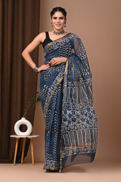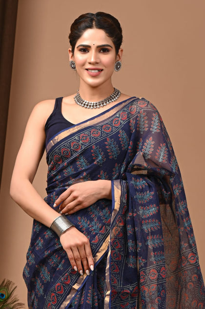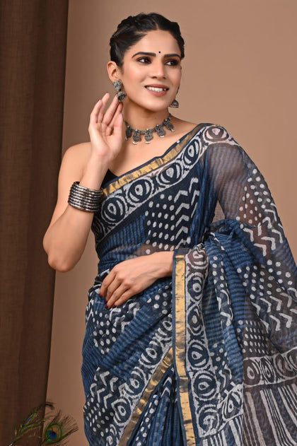 Bagru Kota Doria sarees are a striking and eye-catching work of art that blend the lively hand block prints of Bagru with the delicate checks of Kota Doria.