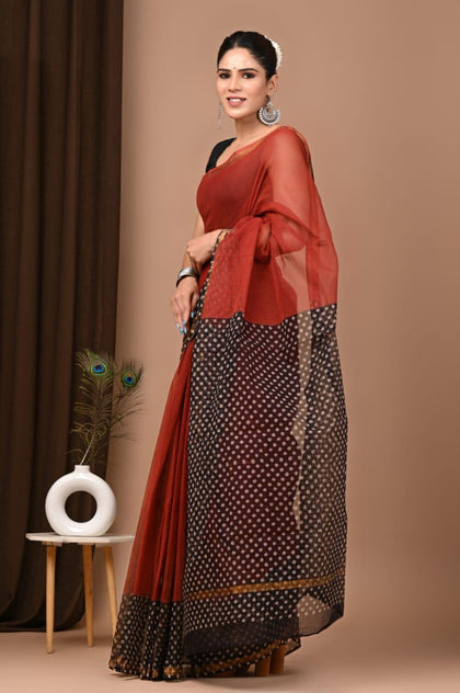 Since Bagru designs have historically exclusively used natural colors derived from plants and minerals, the sarees are sustainable and kind to the environment. Each Bagru Kota Doria saree is unique because of the hand block printing process; little differences in the design and color add to the saree's particular appeal.