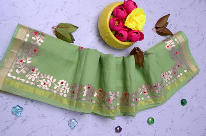 Cotton-made kota gota patti sarees in particular are incredibly airy and perfect for summer use. These have traditional Gota patti embroidery on the borders and pallu, and they are composed entirely of Kota cotton. Kota in Rajasthan is well-known for its sarees, and Rajasthan is recognized for its cheerful hues. The desert state of Rajasthan is the birthplace of the Kota saree. Small villages close to the Rajasthani city of Kota are the makers of Kota sarees. Because Kota sarees are comprised of a very translucent yet strong cotton or cotton-silk weave, they are also known as Kota Doria sarees. Women wear this saree for all religious and festive events. With every Charak Polish and rinse, it will be like new.
