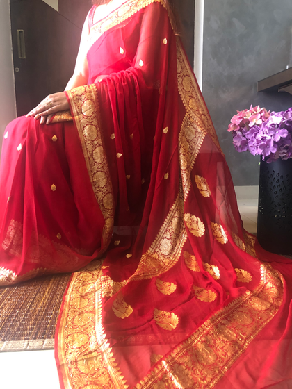 Red With Golden Work Banarasi Zari work Semi Georgette Saree