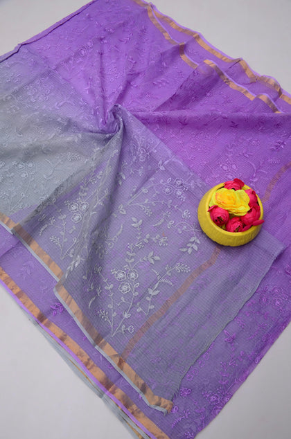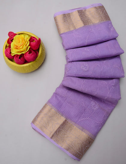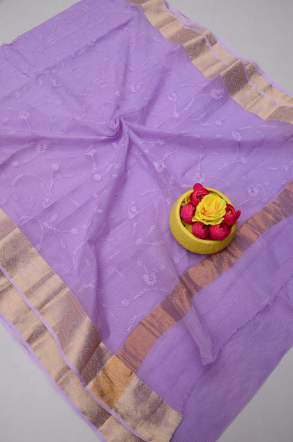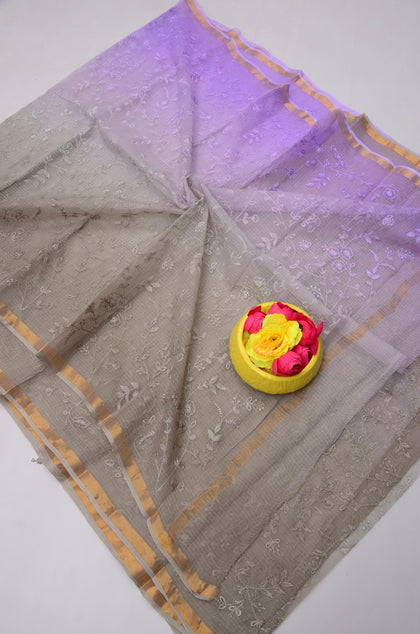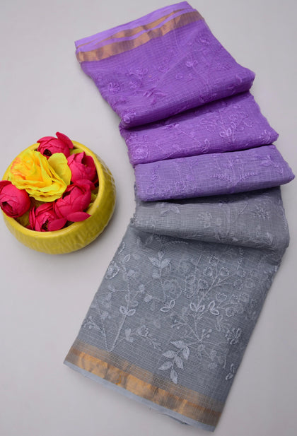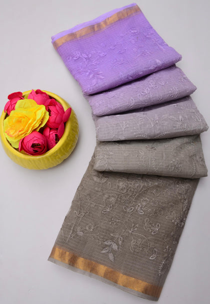 Kanchan- Grey & Light Purple Kota Doria Embroidery Work Saree