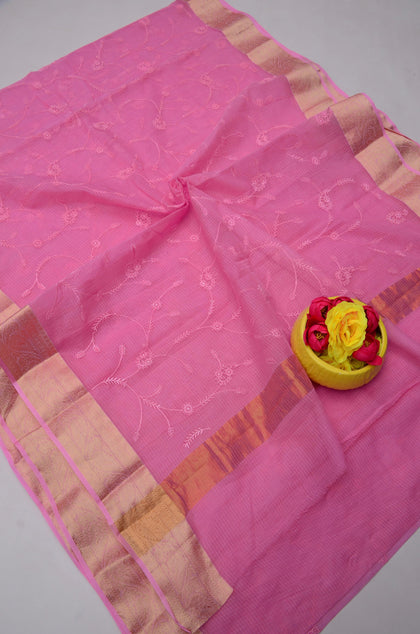 Pink Kota Doria Embroidery Work Sari