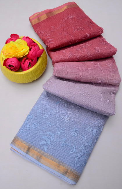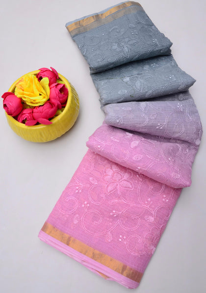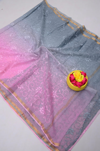 Phoolmati- Pink & Grey Kota Doria Embroidery Work Saree