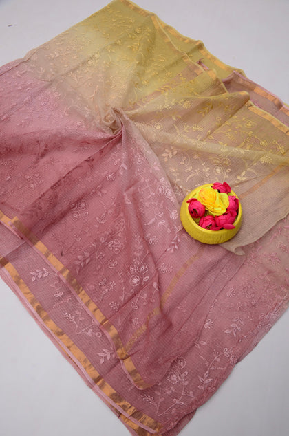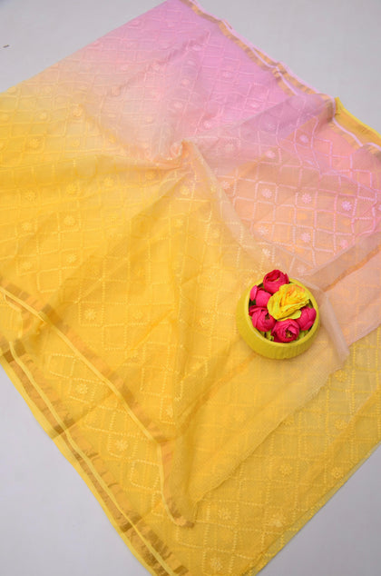 Sugna- Pink & Yellow Kota Doria All Over Embroidery Work Saree