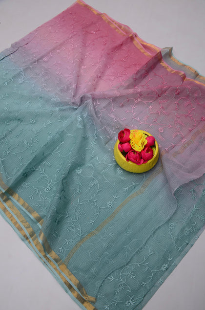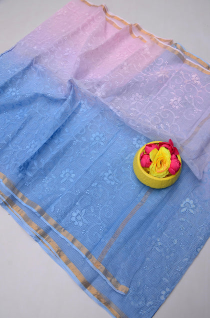 Tejwati- Blue & Baby Pink Kota Doria Embroidery Work Saree