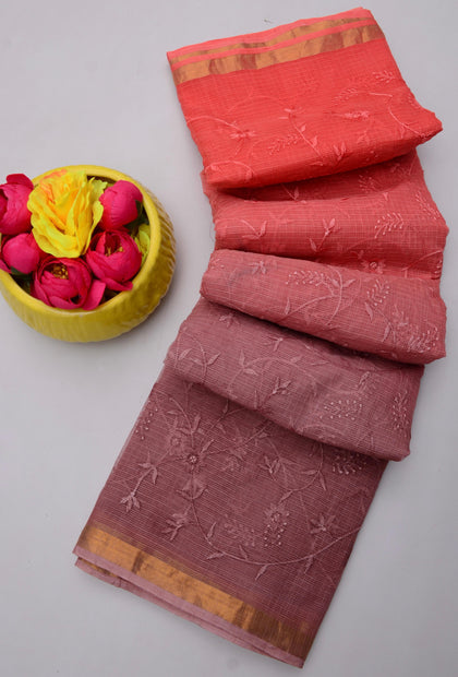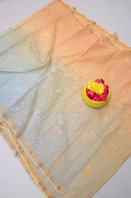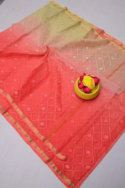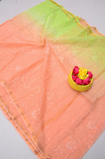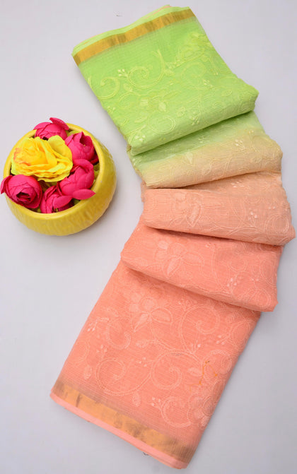 Shakuntala- Peach & Green Kota Doria Embroidery Work Saree