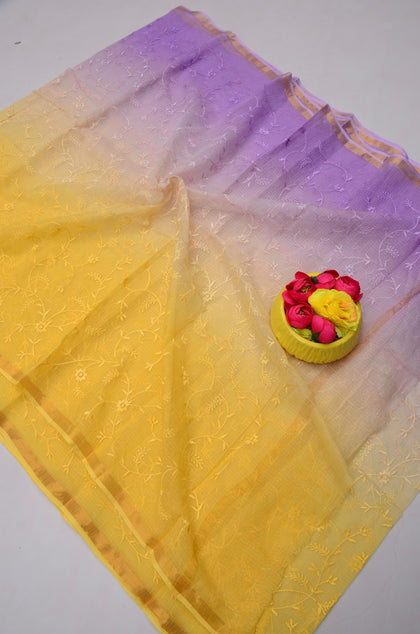 Rajrani- Yellow & purple Kota Doria All Over Embroidery Work Saree