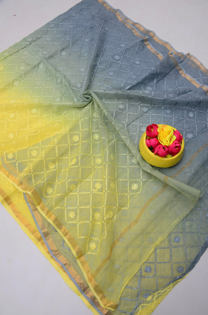 Padma- Grey & Yellow Kota Doria All Over Embroidery Work Saree