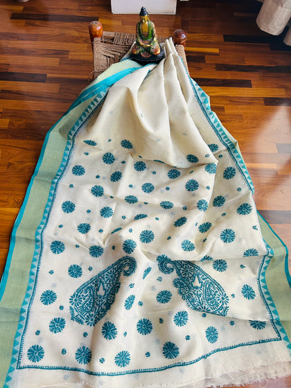 Off White Kota Doria Embroidery Work Sari