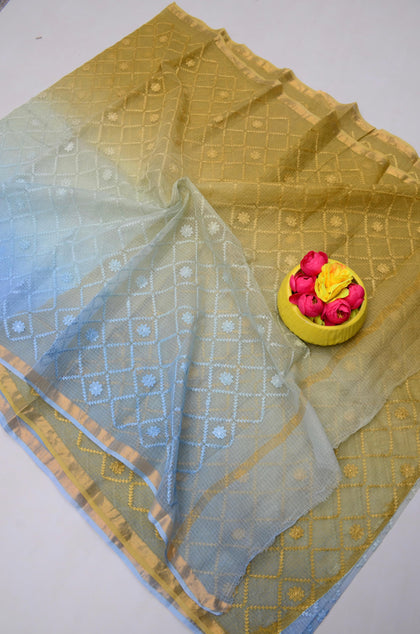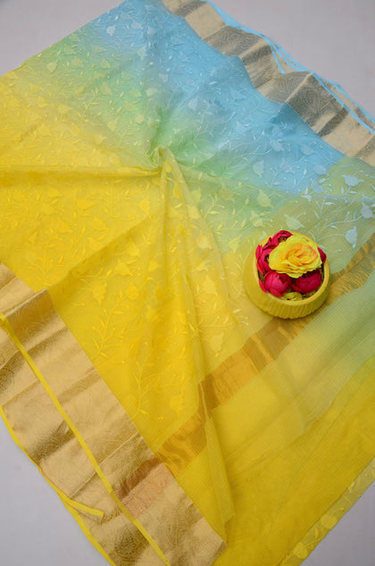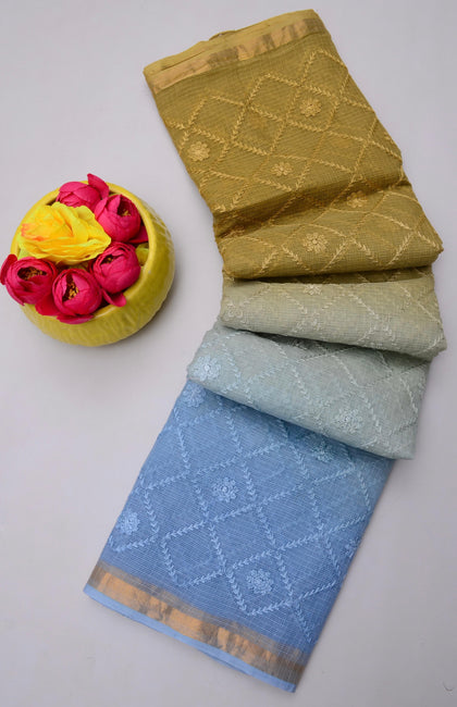Kamla- Blue & Yellow Kota Doria All Over Embroidery Work Saree