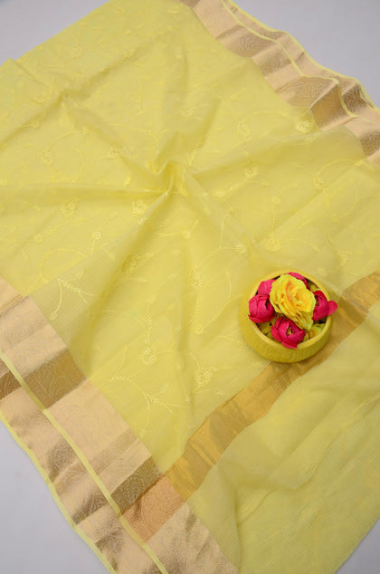 Pastel Yellow Kota Doria Embroidery Work Sari
