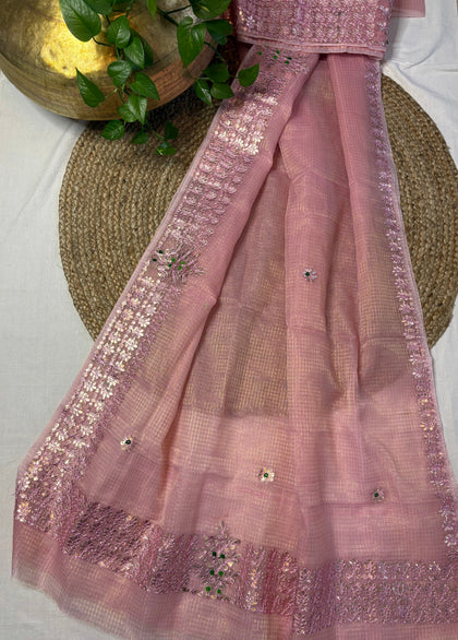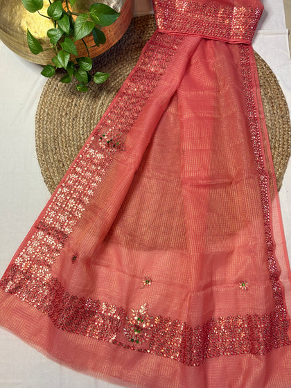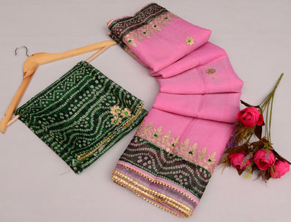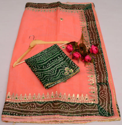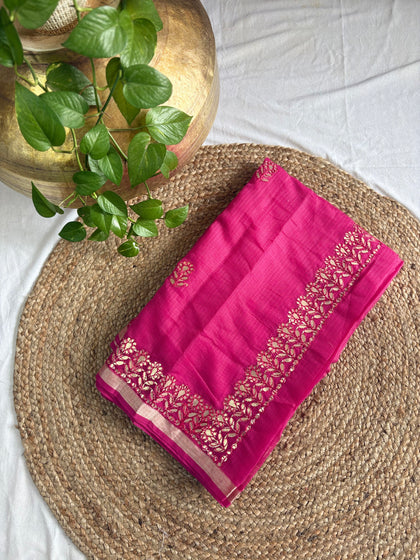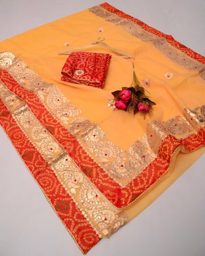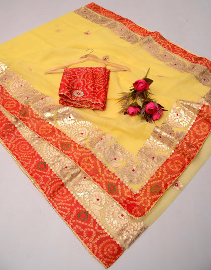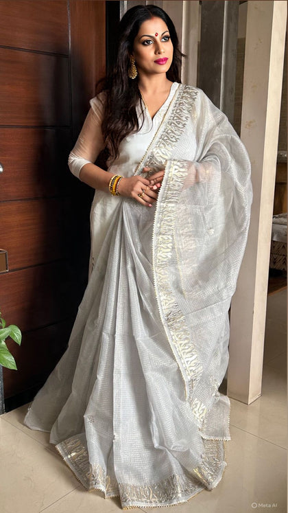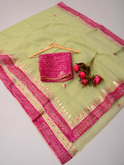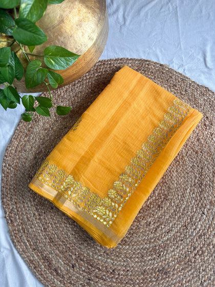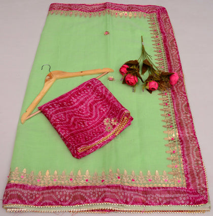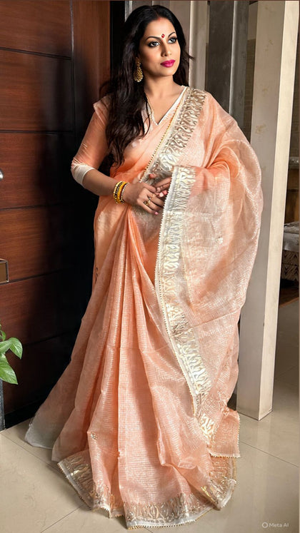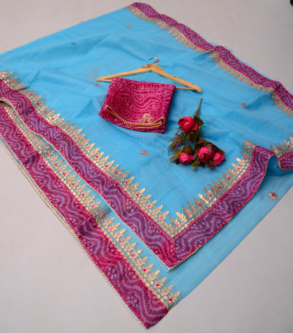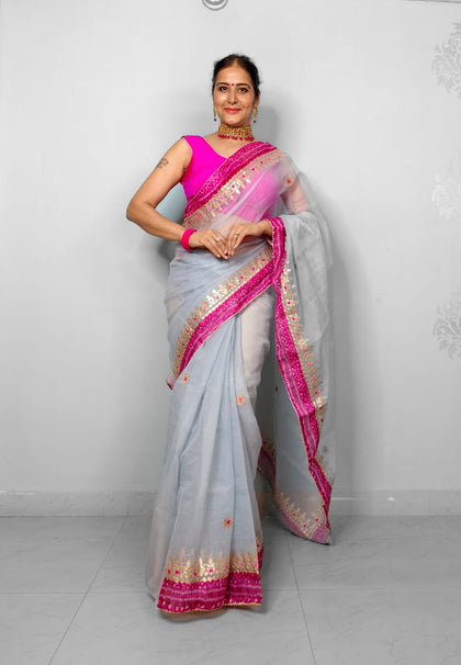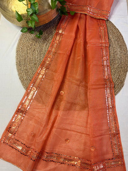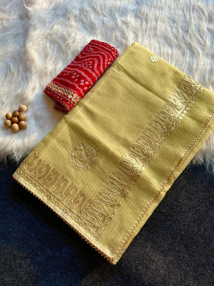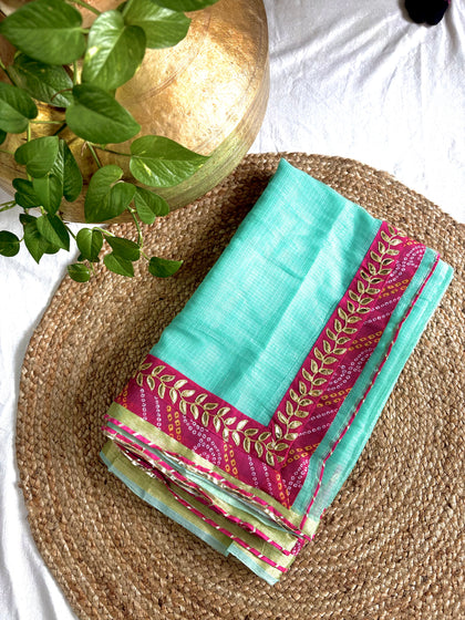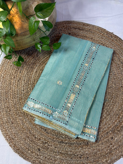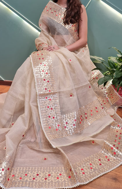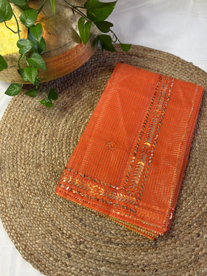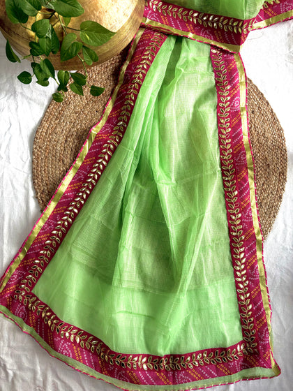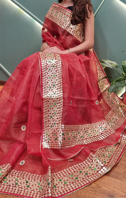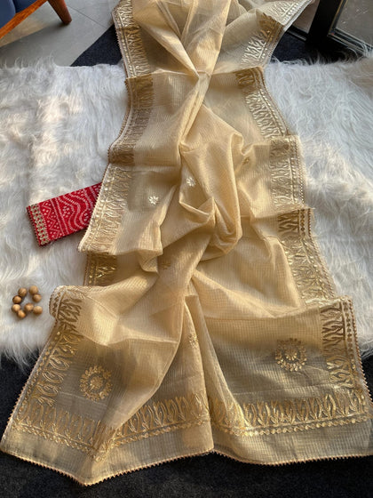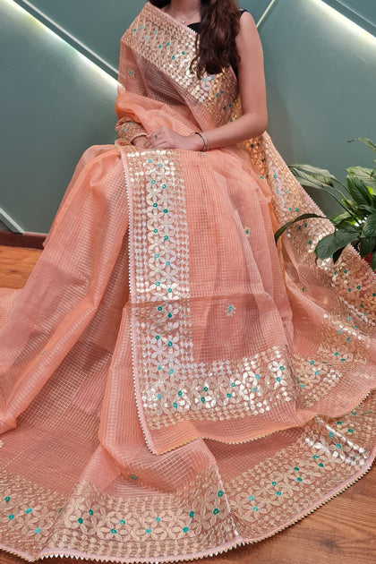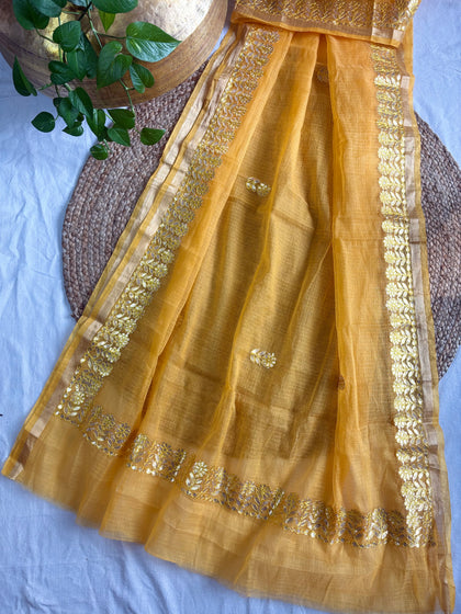 Shop premium gota patti sarees in kota doria fabric, perfect for wedding theme for your family and guests, the saree is perfect gift for ur loved ones as wedding giveaways.