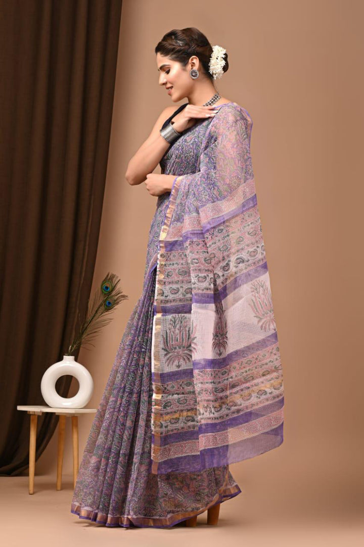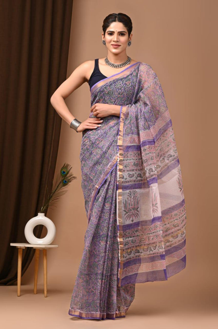 - Sahira- Authentic Floral Pink Trending Hand-Block Print Kota Doriya Saree