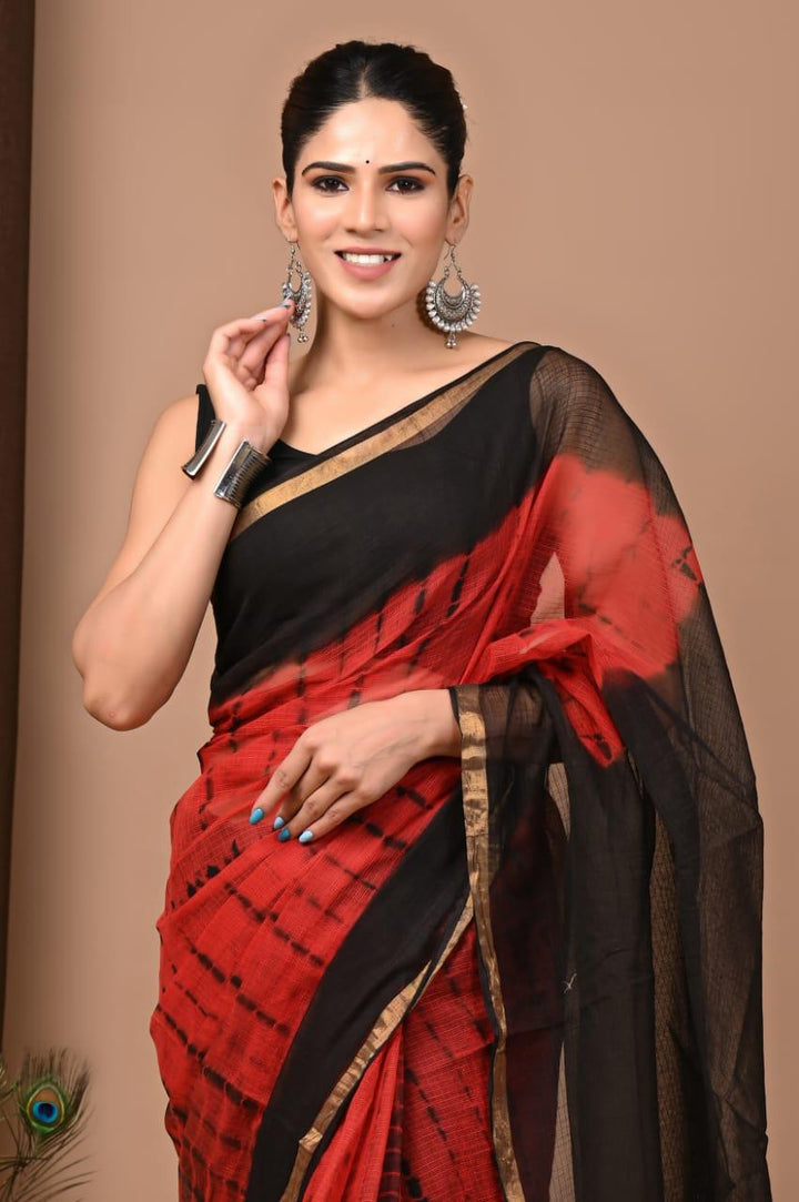 - Sujata- Authentic Red Floral Trending Hand-Block Print Kota Doriya Saree