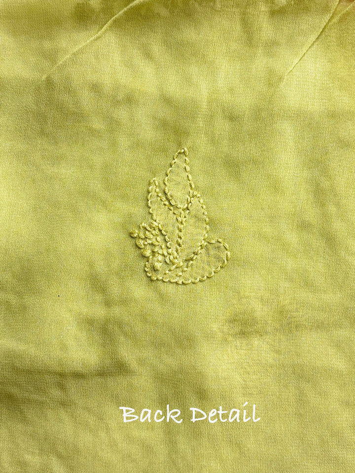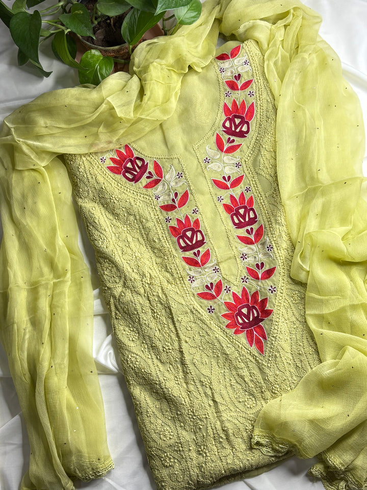 Unstiched 3 Piece Chikankari Dress Material. Top 3 mtr pure viscose georgette Top , Dupatta 2.5 mtr chiffon , Bottom 2.5 mtr shantoon (matching top color)