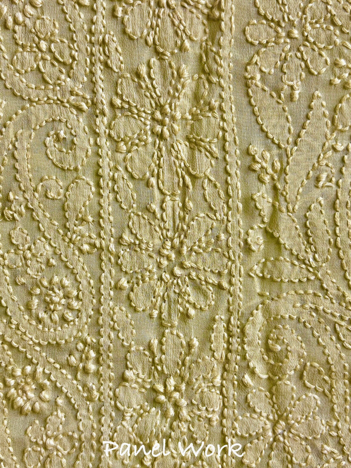 - Full chikankari neck work with resham parsi gara work on neck as on picture , beautifil detailings on back and border work on sleeves, the neckline is really rich and heavy