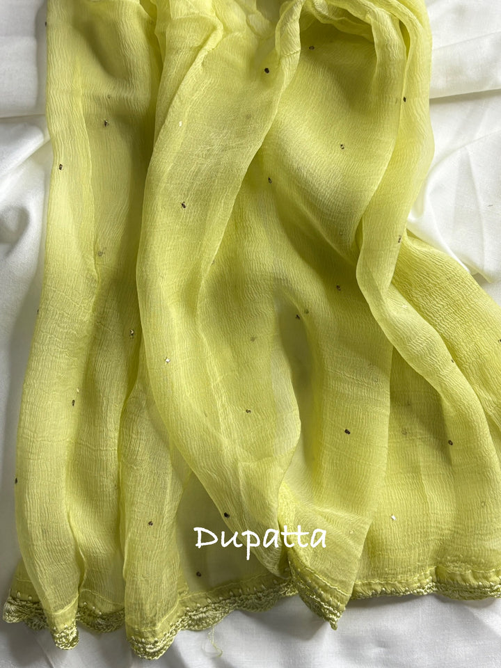 - Dupatta is of pure chiffon with mukaish detailing and crochet border