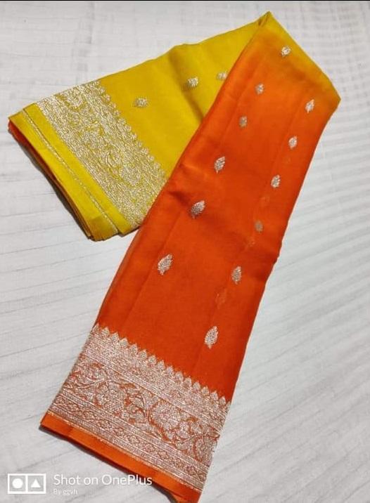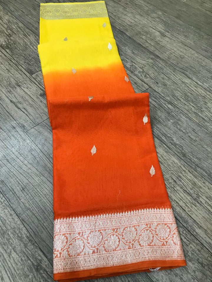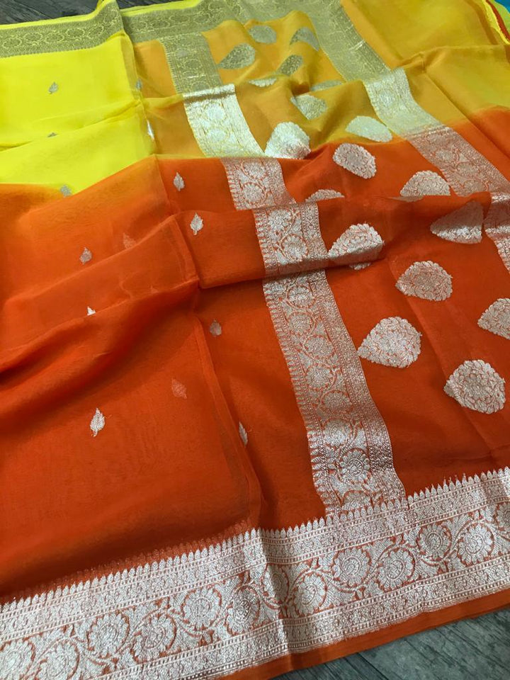 Unique Banarasi Chiffon Khaddi Saree In Yellow Orange Ombre