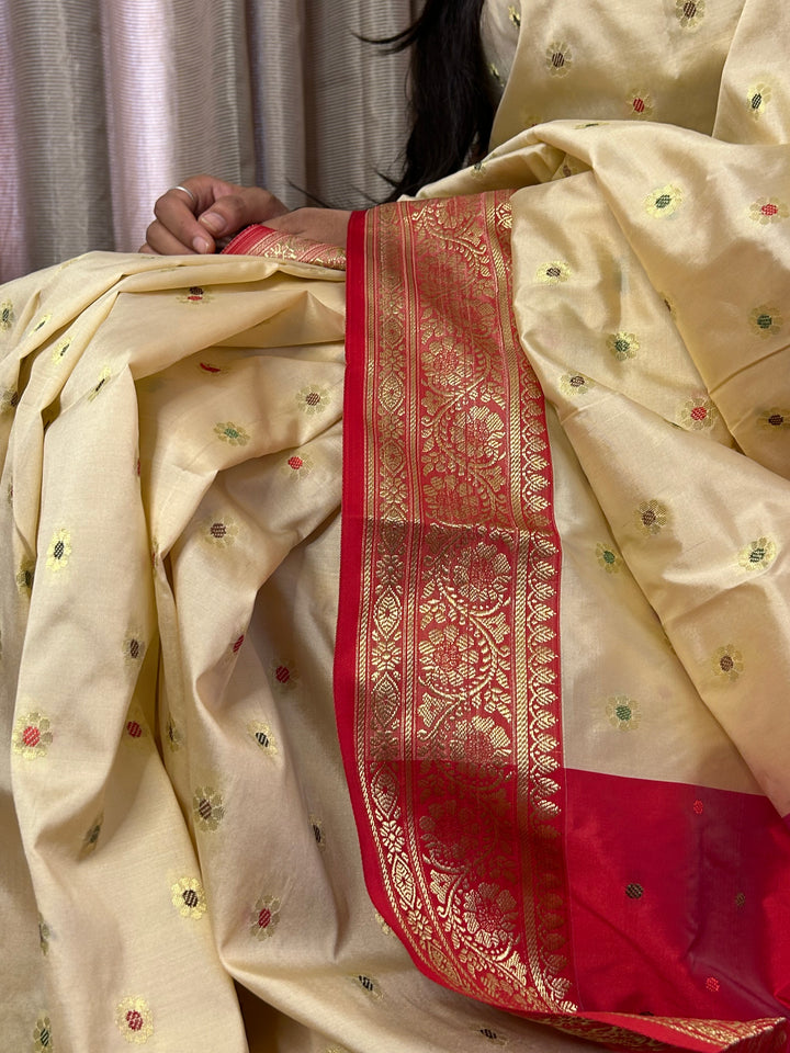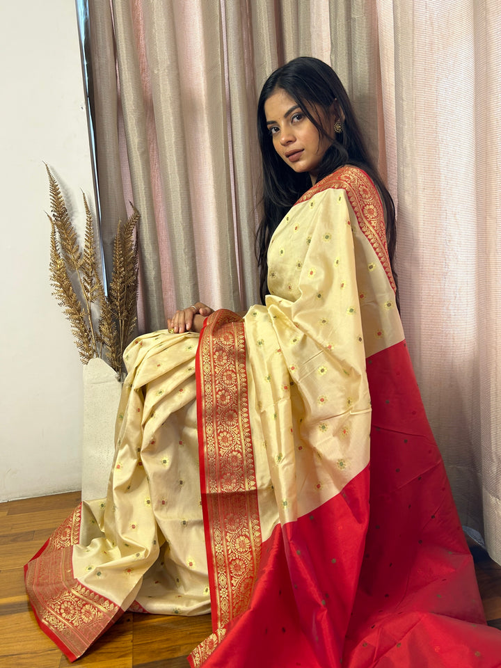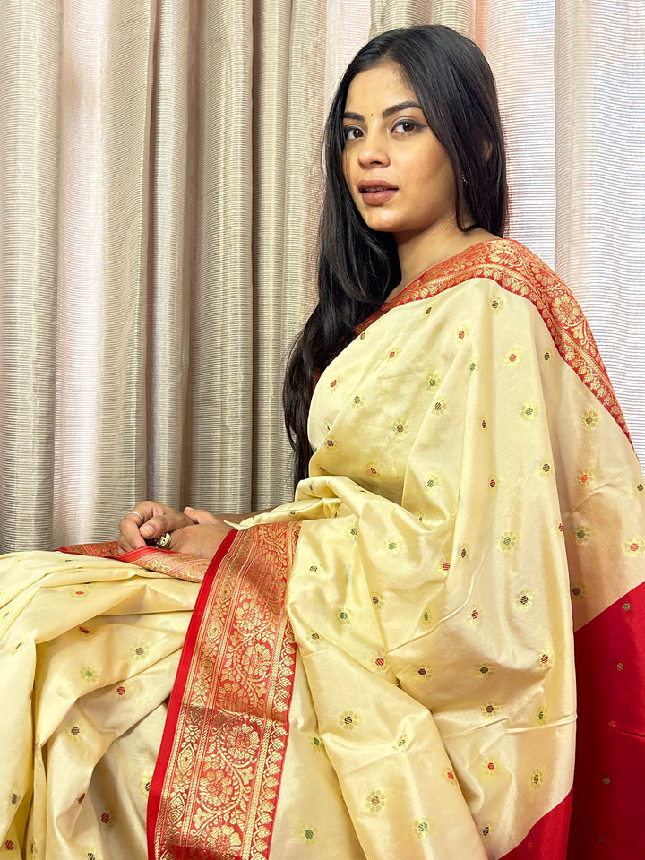 Cream & Red Banarsee Silk Saree Is 6.5 Mtr Long Along With A Unstiched Blouse Piece With Beautiful Butas All Over On It.
