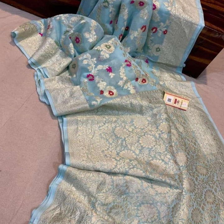 - Sky Blue Floral Banarasi Semi-Georgette Saree