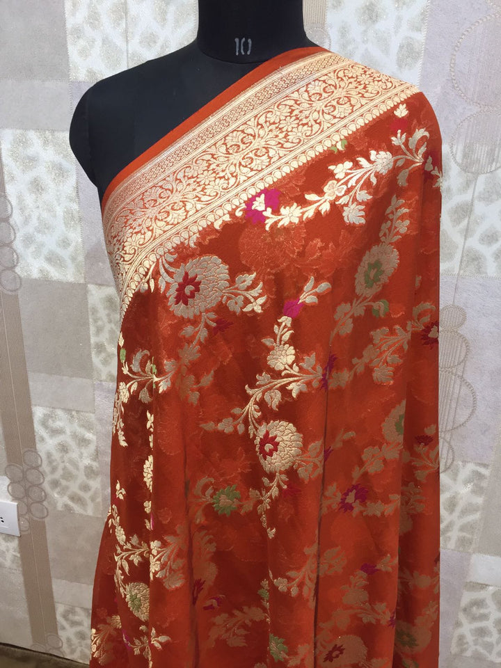 Red Floral Jaal Semi Georgette Banarasi Saree