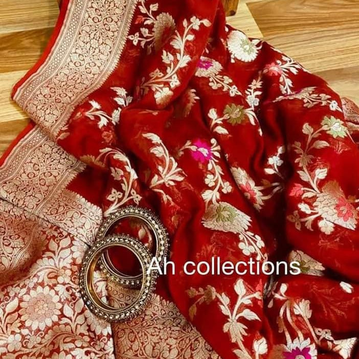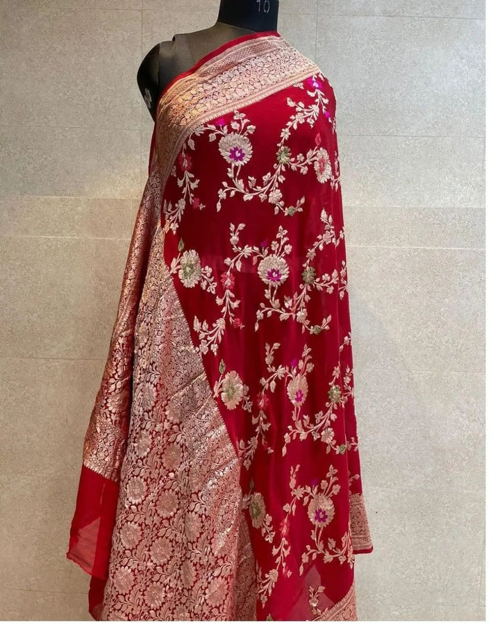 - Ruby Red Floral Banarasi Semi-Georgette Saree