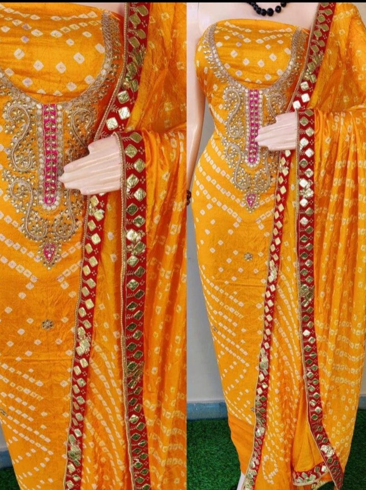 Bandhej Silk Gota Work Suit in Yellow,Silk Top With Gota Work And Silk Duptta With Gota Work And Plain Santoon Bottom, Shop Heavy Wedding Suits Online.Jaipuri Gota Patti Hand Work On Top(2.5mtr) With Designer BandhejDupatta (2.5 mtr) Which Comes With Border. The Dress Material Comes With Bottom (2.5 mt) Matching dupatta color.