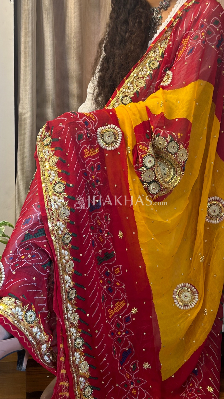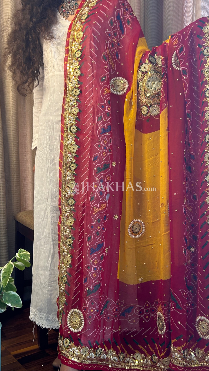 Make This Beautiful Bandhani Georgette Dupatta A Part Of Your Traditional Wardrobe And Make Your festivities And Wedding Celebrations Special. This Bandhej Georgette Chunari Is Embellished With Beautiful Gota Patti , Pearl and Handwork