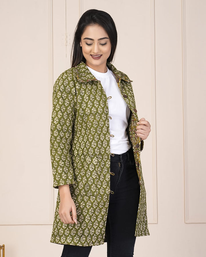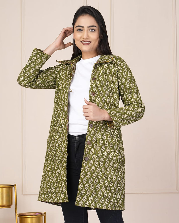Beautiful Green Pure Cotton Quilted Reversible Print Long Jackets