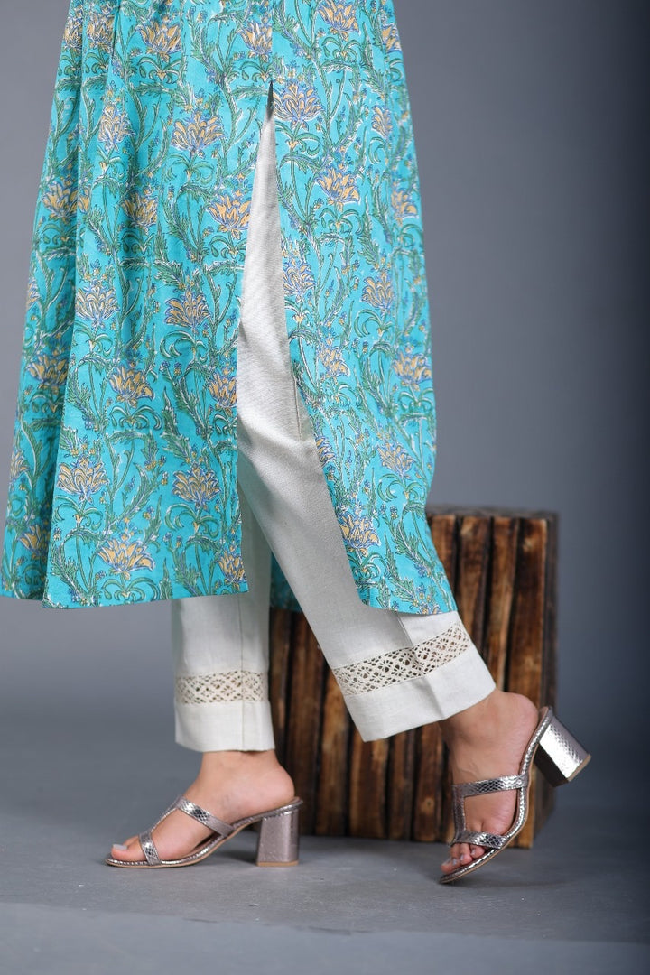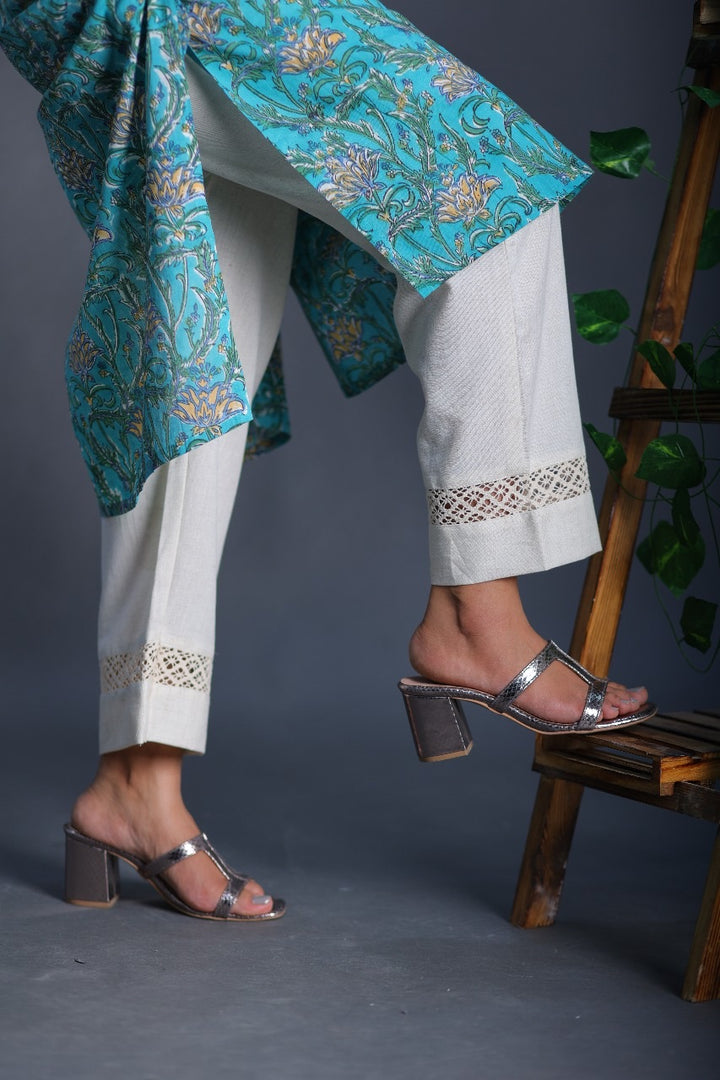 Gulnaz Cream Straight Pant In Cotton With Cutwork Lace